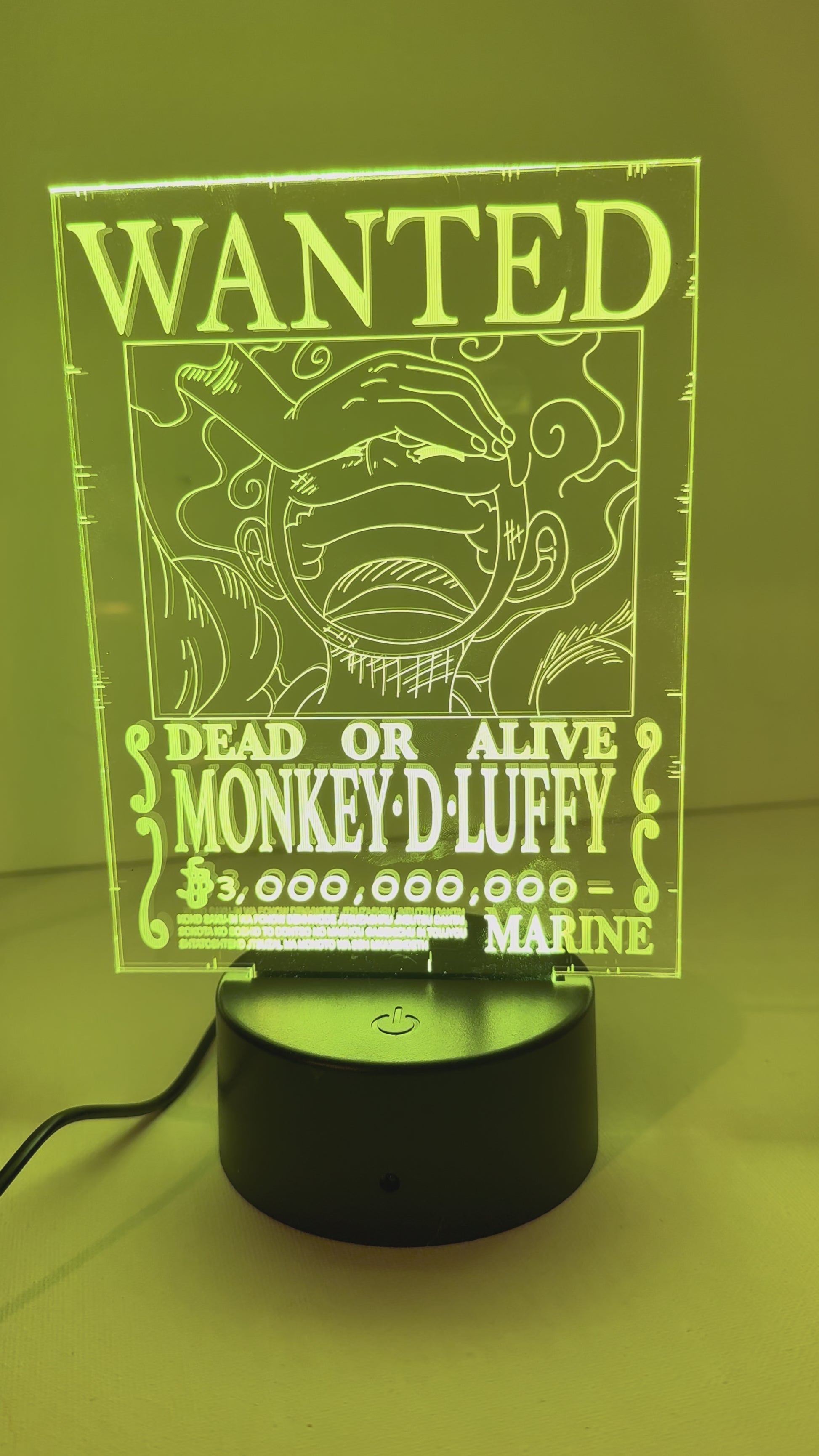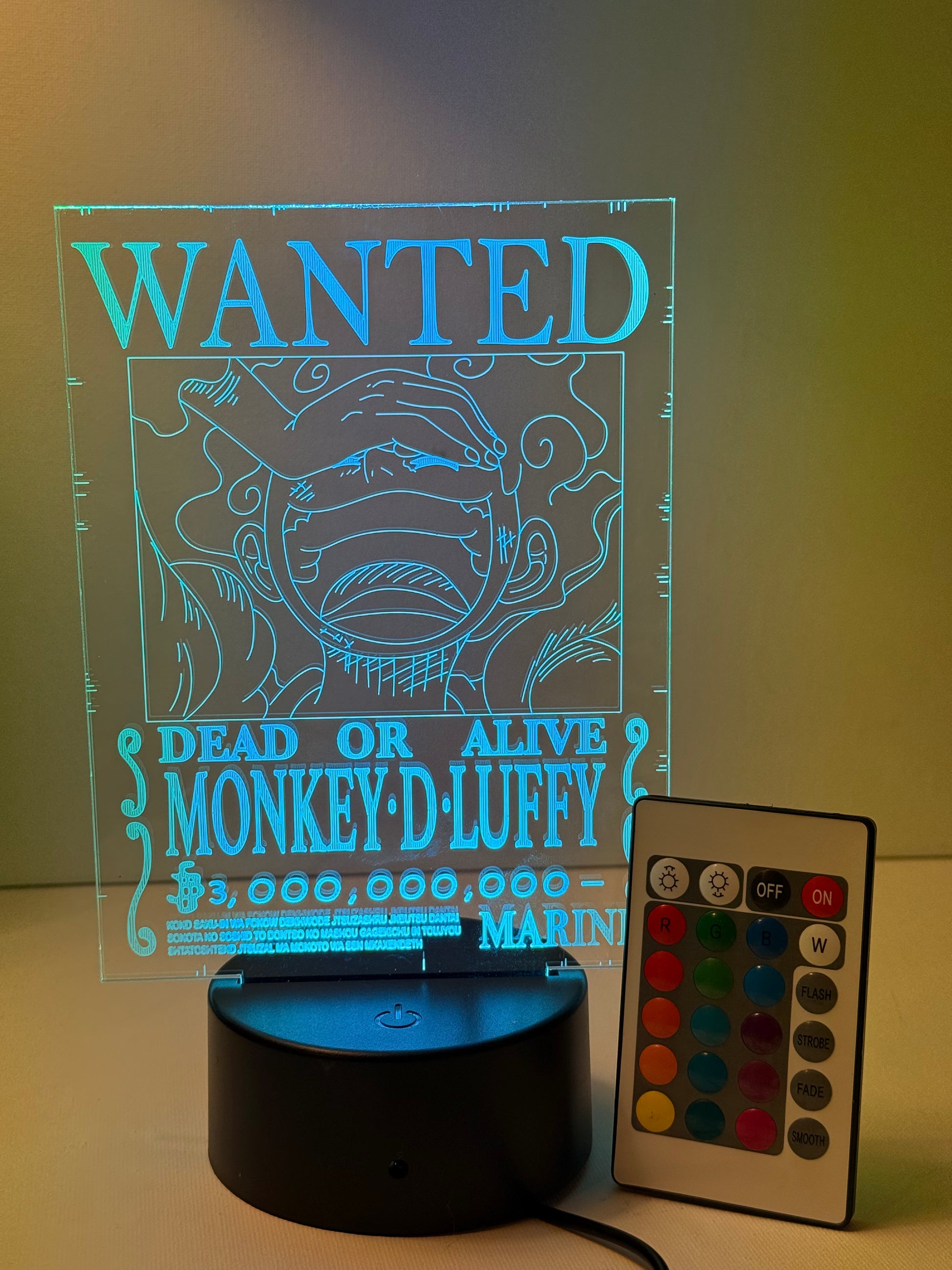 "One Piece 'Wanted' LED Night Lamp – Featuring Monkey D. Luffy’s iconic bounty poster in glowing acrylic. Perfect for anime fans, desk setups, or cozy night vibes!"